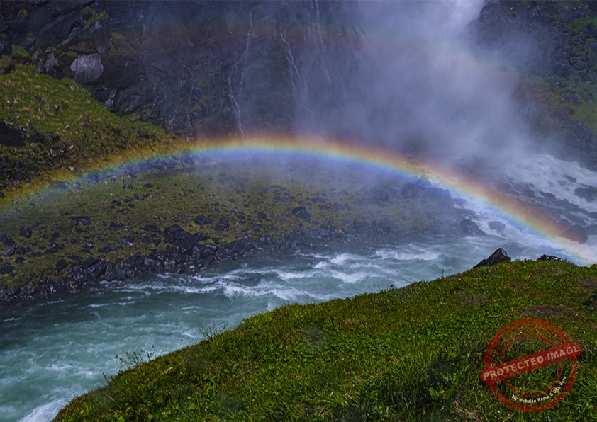 Fossens brus og solas stråler, gir oss en vakker regnbue.